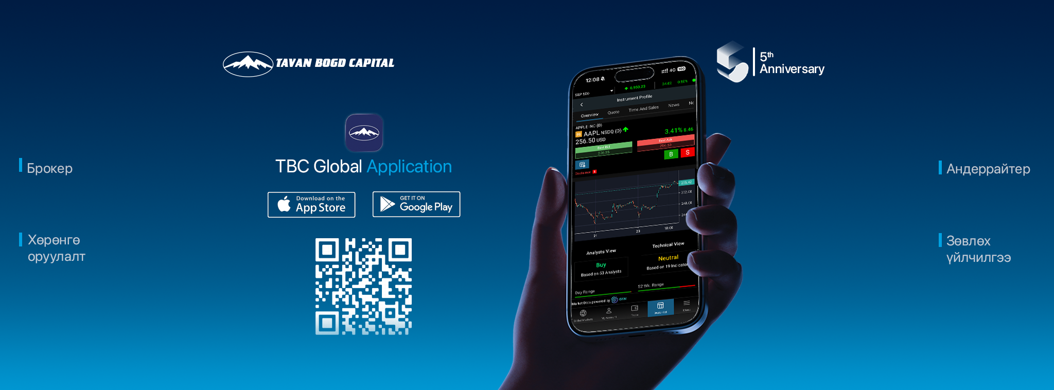 Дэлхийн 82 орны 87 биржийн арилжаанд хүссэн үедээ, хаанаас ч дэлхийн шилдэг компаниудыг нэгж хувьцааг хамгийн багадаа 100 төгрөгөөр бутархайлан худалдаж авах шууд арилжаанд оролцож болох "TBC GLOBAL" аппликейшныг санал болгож байна.