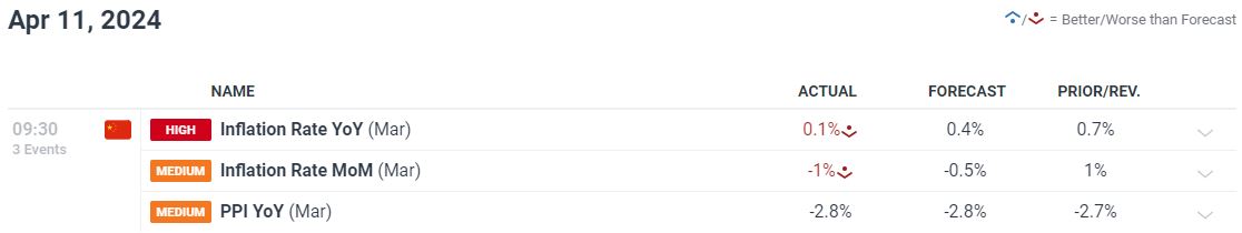 Өнгөрсөн Пүрэв гарагийн 9:30 цагт БНХАУ –н 3 –р сарын инфляцын мэдээ гарлаа. Өнгөрсөн 3 –р сард инфляц өмнөх жилтэй харьцуулахад 0.1% өсөж хүлээлт 0.4% хүрсэнгүй. Уг үзүүлэлт Цагаан сарын баяр тохиосон 2 –р сард 0.7% гарж байсан билээ. Энэ нь БНХАУ –н инфляц зорилтот 3% түвшинд очих болоогүй буйг илтгэж, зах зээлд сөрөг мэдээ боллоо. Түүнчлэн 3 –р сард инфляц өмнөх сартай харьцуулбал 1% -р буурч гарсан нь мөн л хөрөнгө оруулагчдын хүлээлтэд хүрээгүй байна.