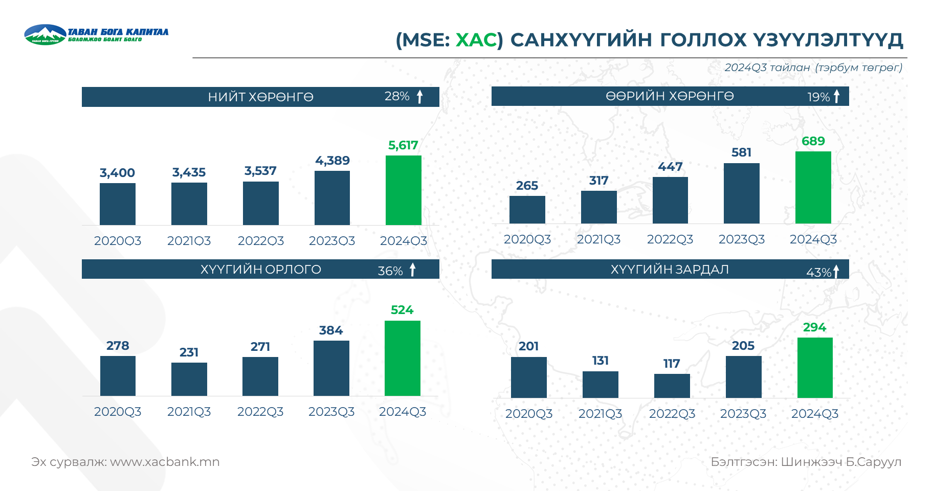 Тус банкны хүүгийн орлого өмнөх оны мөн үеэс 36% өсөж ₮524 тэрбумд хүрсэн бол хүүгийн зардал 43%-аар өсөж ₮294 тэрбумд хүрлээ.