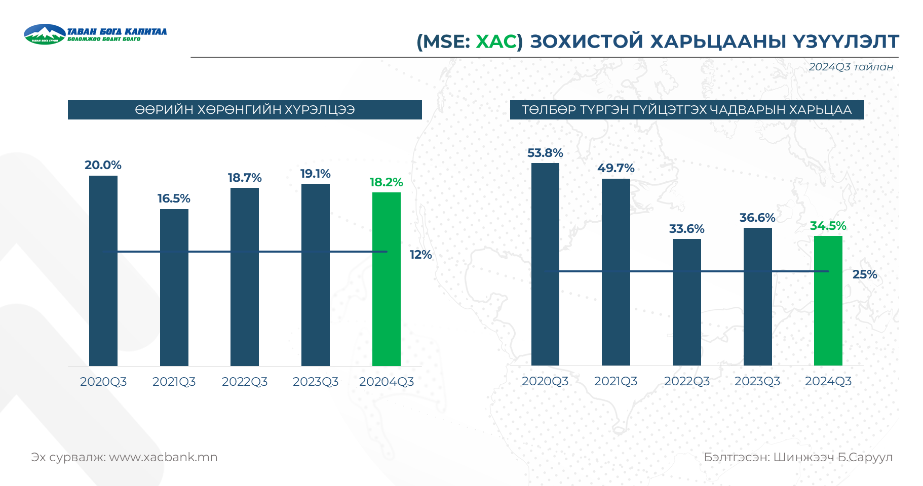 Арилжааны банк нь Монголбанкнаас тогтоосон зохистой харьцааны шалгуур үзүүлэлтүүдийг хангаж ажиллах ёстой байдаг бөгөөд эдгээр үзүүлэлтүүдээс өөрийн хөрөнгийн хүрэлцээ болон хөрвөх чадварын үзүүлэлтүүдийг графикт харуулав.