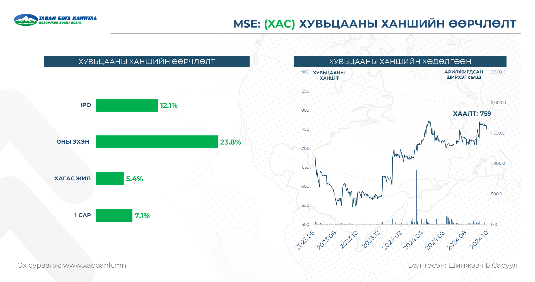 2024.10.14-ны байдлаар компанийн хувьцааны ханш нь IPO хийсэн (677 төгрөг) ханшаас 12.1%-аар өсөж 759 төгрөг орчимд ирсэн байна. Харин оны эхэн үетэй харьцуулахад 23.8% өсөж, нэг жилийн хугацаатай хадгаламжийн хүүнээс даруй 11% өндөр байгаа юм.