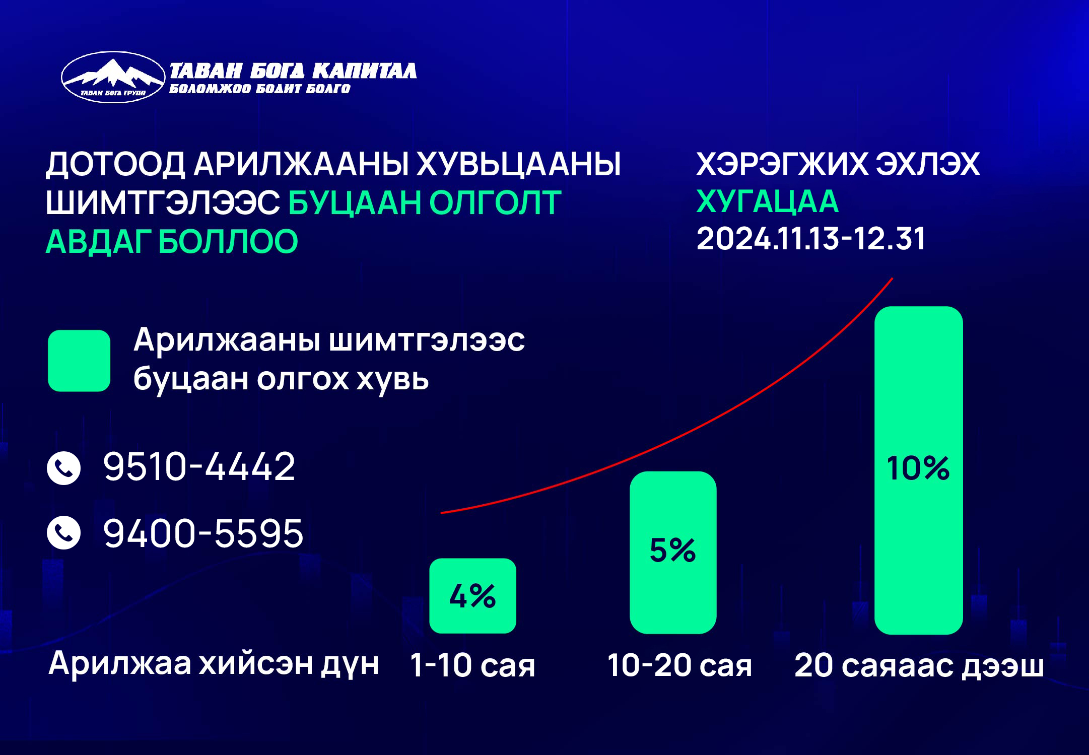 “Таван Богд Капитал ҮЦК" ХХК-аар дамжуулан Дотоод хувьцааны арилжаанд орж, төлсөн шимтгэлээс буцаан олголт буюу “CASHBACK“ авах боломжтой боллоо.
