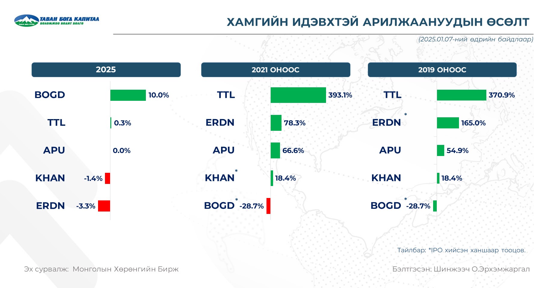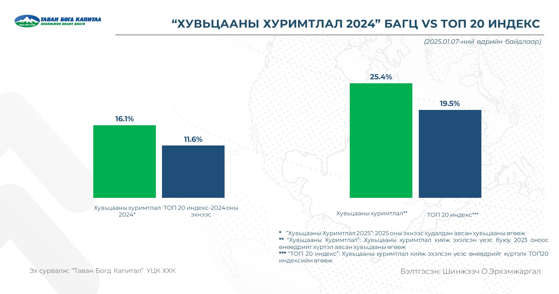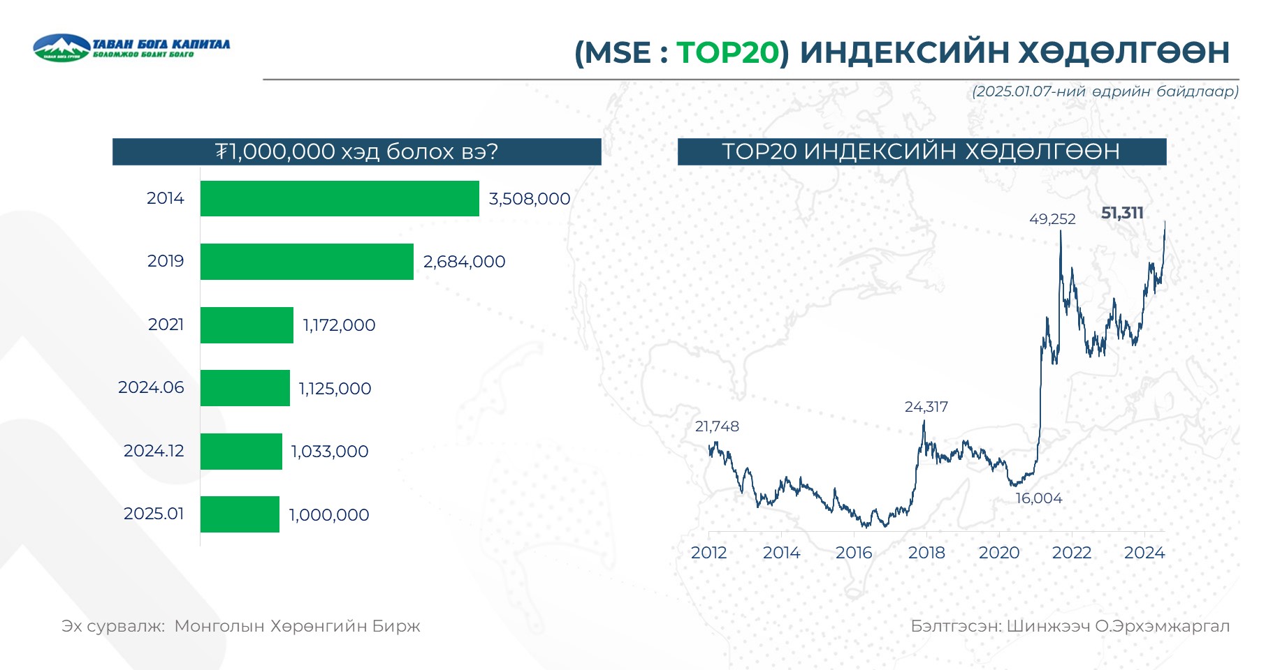 TOP20 индекс 51,311-д хүрсэн нь өмнөх өдрийн хаалтын ханшаас 0.4%-аар өссөн үзүүлэлт байлаа. Хэрвээ 2025.01 сард ₮1,000,000-өөр хөрөнгө оруулалт хийсэн бол 0.4% өсөх байжээ.