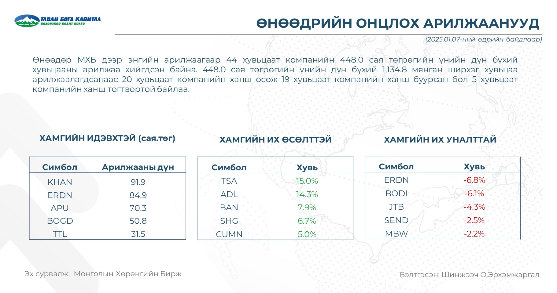 Өнөөдөр биржид: KHAN хувьцааны идэвхээр тэргүүлж 91.9 cая төгрөгийн арилжаа хийгдлээ.