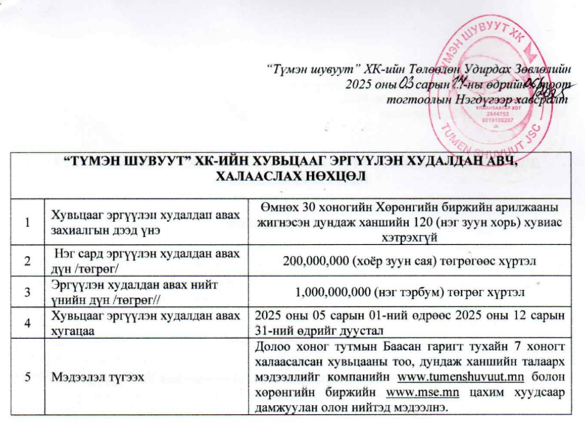 BREAKING NEWS: "ТҮМЭН ШУВУУТ" ХК 1 тэрбум төгрөг хүртэлх дүнгээр хувьцаагаа халааслана