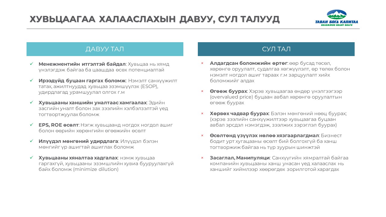 Хувьцаа халааслах нь компанид хэд хэдэн давуу тал бий болгодог. Юуны өмнө энэ нь удирдлагын итгэлийг нэмэгдүүлж, хувьцааны үнэ хэт уналтаас сэргийлэх арга хэмжээ болдог. Ингэснээр хөрөнгө оруулагчид компанийн урт хугацааны үнэлгээнд итгэж, хувьцааны эрэлт нэмэгдэх боломжтой. Мөн EPS (нэгж хувьцаанд ногдох ашиг) болон ROE (өөрийн хөрөнгийн өгөөж) өсөх нөхцөл бүрдэж, хувьцаа эзэмшигчдийн үр өгөөж сайжирна. Түүнчлэн, нэмэлт хувьцаа гаргахгүй учраас хувьцаа эзэмшигчдийн эзэмшлийн хувь буурахгүй бөгөөд хяналтаа хадгалах давуу талтай.