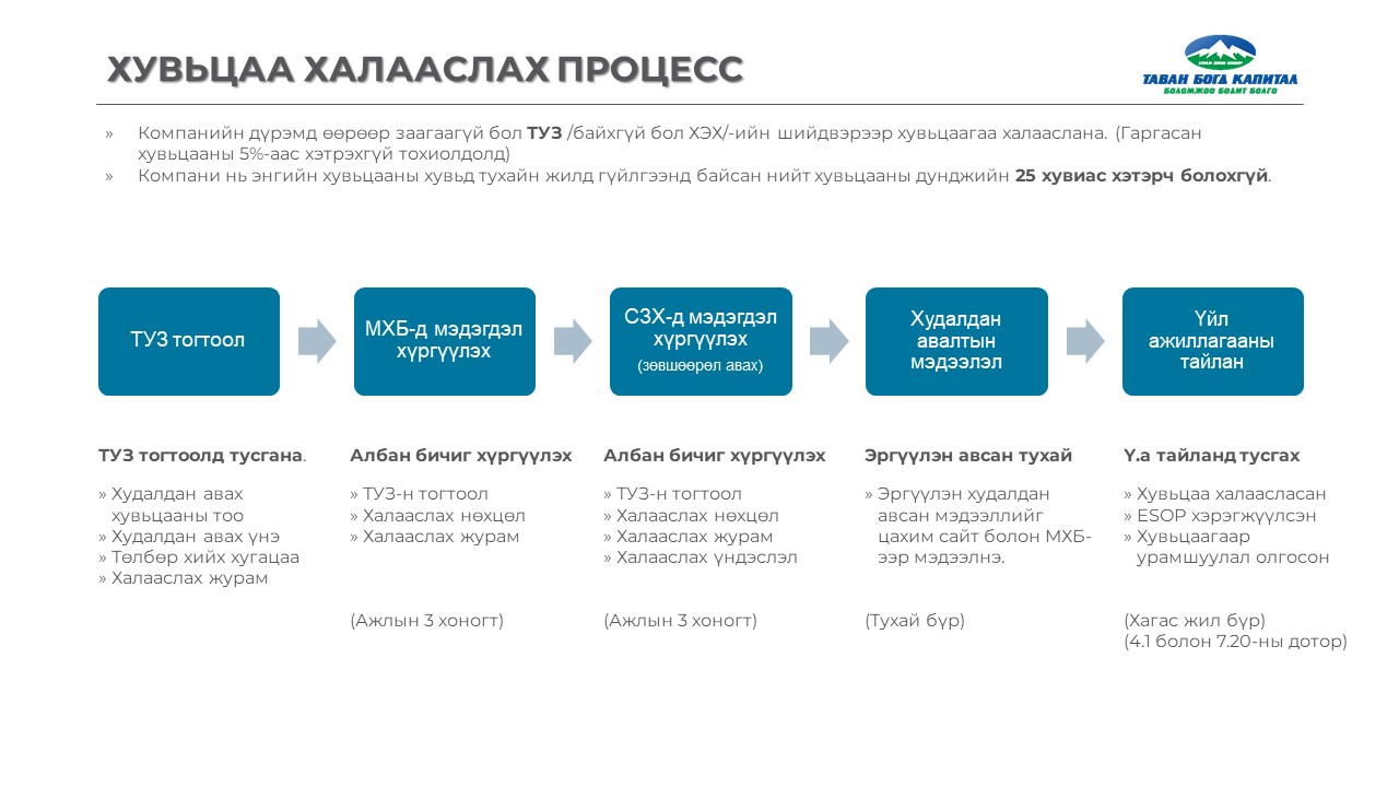 Энэ халааслах үйл явц дараах алхмуудаар хэрэгждэг. Юуны түрүүнд Төлөөлөн Удирдах Зөвлөлийн (ТУЗ) тогтоолыг Монголын Хөрөнгийн Бирж (МХБ)-д хүргүүлж, Санхүүгийн Зохицуулах Хорооны (СЗХ) зөвшөөрлийг авах шаардлагатай. Дараа нь худалдан авалтын талаар олон нийтэд мэдээлэл хүргэж, хагас жил тутамд үйл ажиллагааны тайлан гарган танилцуулна. Тухайлбал, 4 сарын 1 болон 7 сарын 20-ний дотор үйл ажиллагааны тайландаа нийтлэх шаардлагатай.