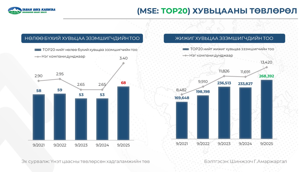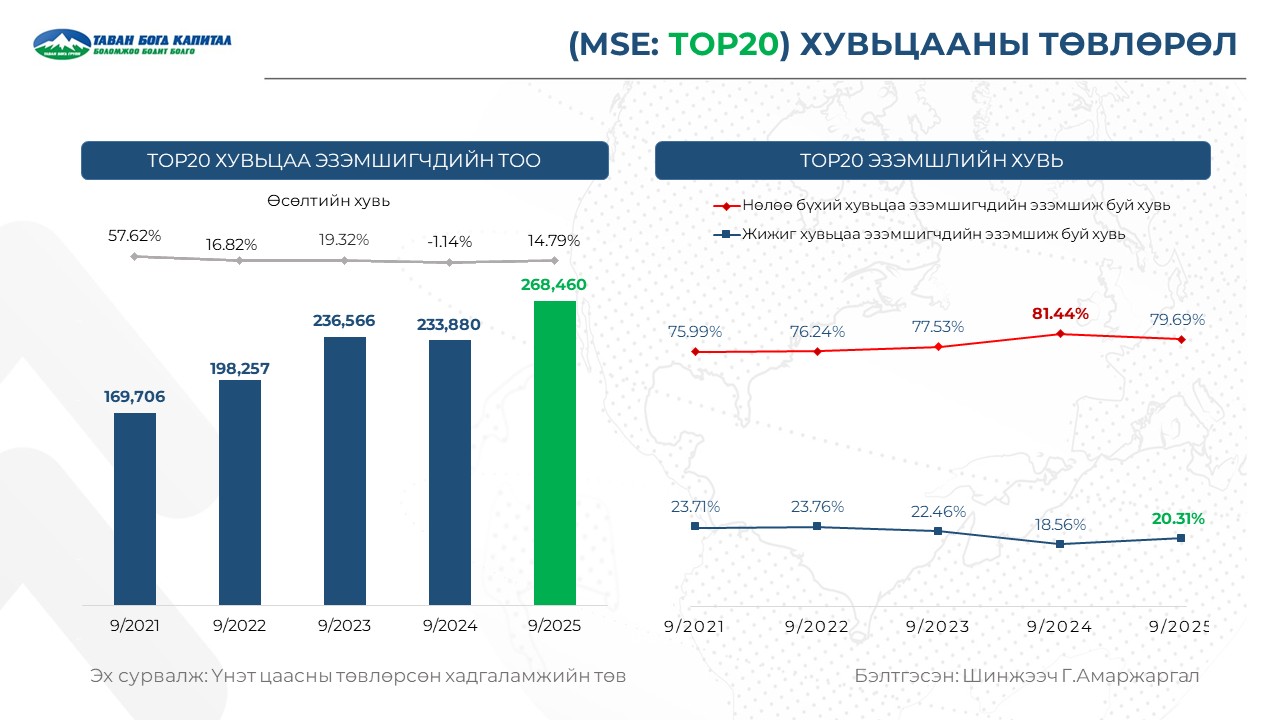 2025 оны 9-р сард ТОП-20 индексийн компаниудын нийт хувьцаа эзэмшигчдийн тоо өмнөх оны мөн үеэс 14.8%-аар өсөж нөлөө бүхий хувьцаа эзэмшигчдийн эзэмшлийн хувь 79.7% болж, 1.7 нэгж хувиар буурсан байна. Ингэснээр 2-3 том хувьцаа эзэмшигч нийт хувьцааны 79.7%-ийг эзэмшиж байгаа бол жижиг хувьцаа эзэмшигчид 20.3%-ийг эзэмшиж байна.