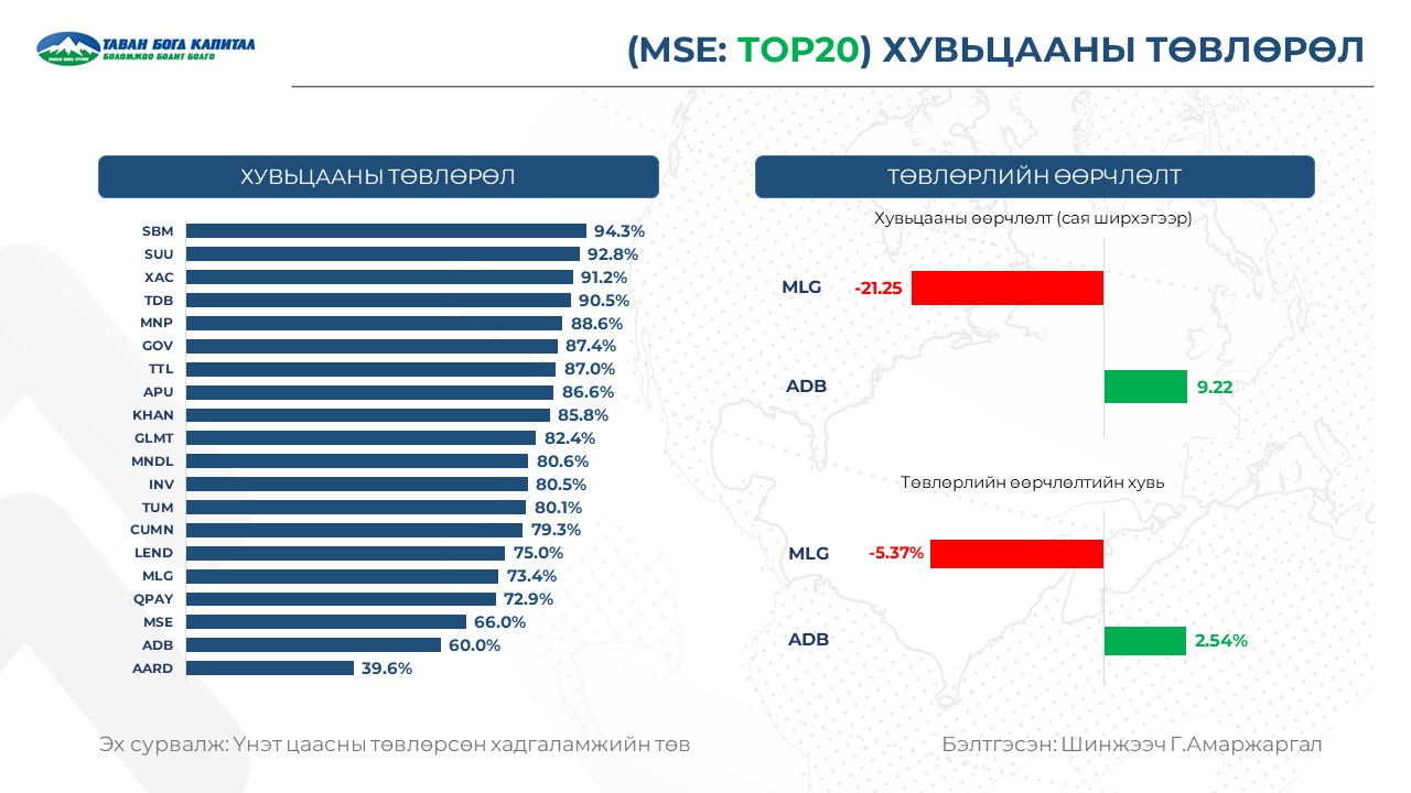 ТОП 20 индексээс Төрийн банк ХК, Сүү ХК, Хас Банк, Худалдаа хөгжлийн банк, Монгол шуудан ХК-ууд төвлөрөл хамгийн өндөртэй байна. 2025 оны 9-р сард ТОП-20 багцыг бүрдүүлж буй компанийн эзэмшлийн төвлөрөлд дараах өөрчлөлтүүд ажиглагдлаа. MLG хувьцааны нөлөө бүхий хувьцаа эзэмшигчдийн тоо 5-аас 4 болж эзэмшлийн хэмжээ 25.2 сая ширхэгээр буурсан бөгөөд энэ нь нийт гаргасан хувьцааны 5.4%-тай тэнцэж байна. Уг өөрчлөлт нь томоохон хувьцаа эзэмшигчийн хувьцаа зарсан эсвэл бусдад шилжүүлсэн болохыг харуулж байгаа бөгөөд компанийн хувьцааны эзэмшлийн төвлөрөлд нөлөөлөхүйц чухал үзүүлэлт юм. Ийм өөрчлөлт нь компанийн удирдлагын бүтэц, зах зээлийн хүлээлт, хөрөнгө оруулагчдын шийдвэр гаргалтад тодорхой нөлөө үзүүлж болзошгүй. Хувьцааны ийм хэмжээний шилжилт нь зах зээлд дохио өгөх боломжтой бөгөөд хөрөнгө оруулагчдын анхаарлыг татах үйл явдалд тооцогддог. Харин ADB хувьцааны нөлөө бүхий хувьцаа эзэмшигчдийн тоо 3-аас 4 болж эзэмшлийн хэмжээ 9.2 сая ширхэгээр өссөн бөгөөд төвлөрөл 2.5%-аар нэмэгдсэн үзүүлэлттэй гарчээ.