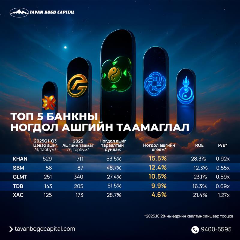 Банкны салбарын топ-5 банкны 2025 оны гуравдугаар улирлын санхүүгийн тайлангууд нийтлэгдэн гарсантай холбогдуулан, бид харилцагчдадаа зориулан ирэх онд банкны ногдол ашгийн өгөөжийг урьдчилан тооцооллоо.