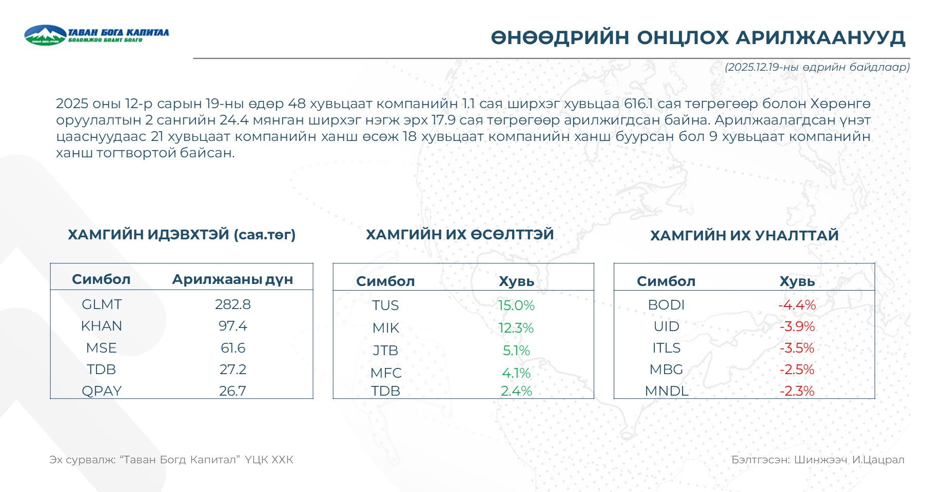 - Өнөөдөр GLMT хувьцаа арилжааны идэвхээр тэргүүлж 282.8 сая төгрөгийн арилжаа хийгдлээ.