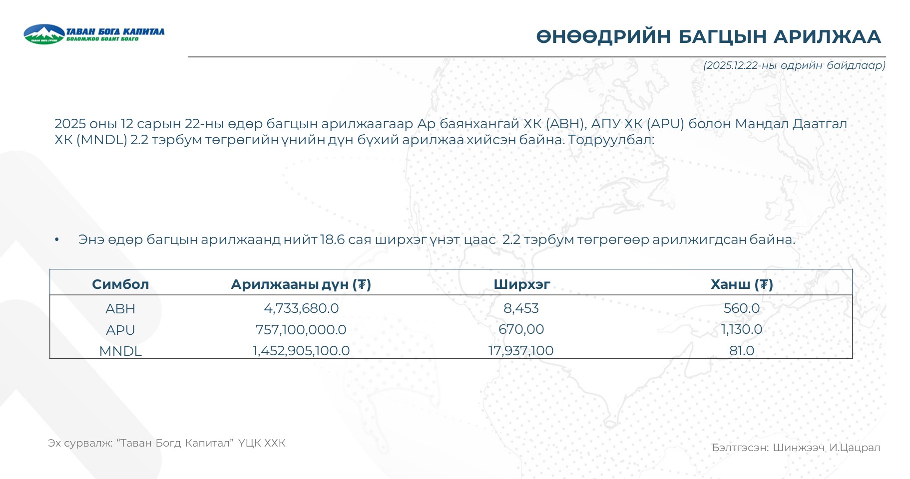 - Энэ өдөр багцын арилжаанд ABH, APU болон MNDL хувьцаа 2.2 тэрбум төгрөгөөр арилжигдсан байна.