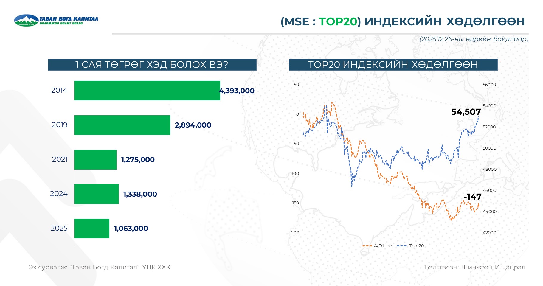 TOП20 индекс 54,507.1 нэгж болсон нь өмнөх өдрийн хаалтын ханштай харьцуулахад 0.2%-аар өссөн үзүүлэлт байлаа. Хэрэв 2025 оны эхэнд ₮1,000,000 -р хөрөнгө оруулалт хийсэн бол өсөж 1,063,000 төгрөг болох байжээ.