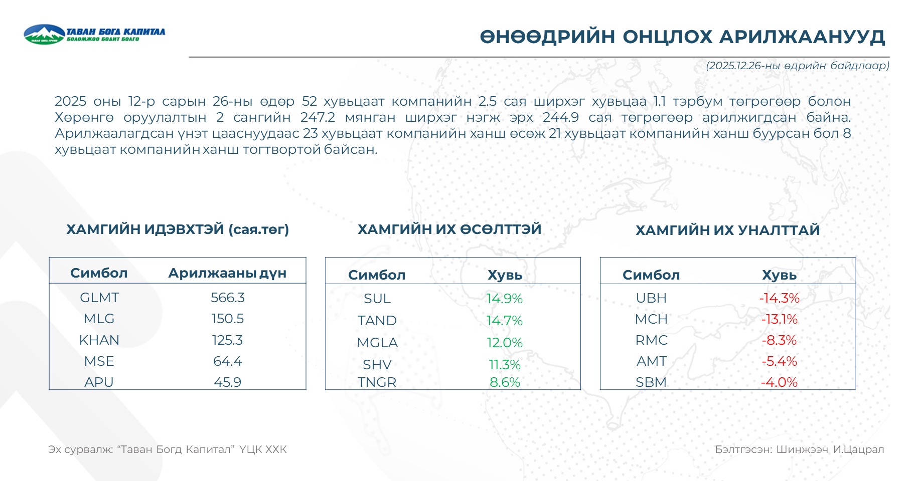 - Өнөөдөр GLMT хувьцаа арилжааны идэвхээр тэргүүлж 566.3 сая төгрөгийн арилжаа хийгдлээ.
