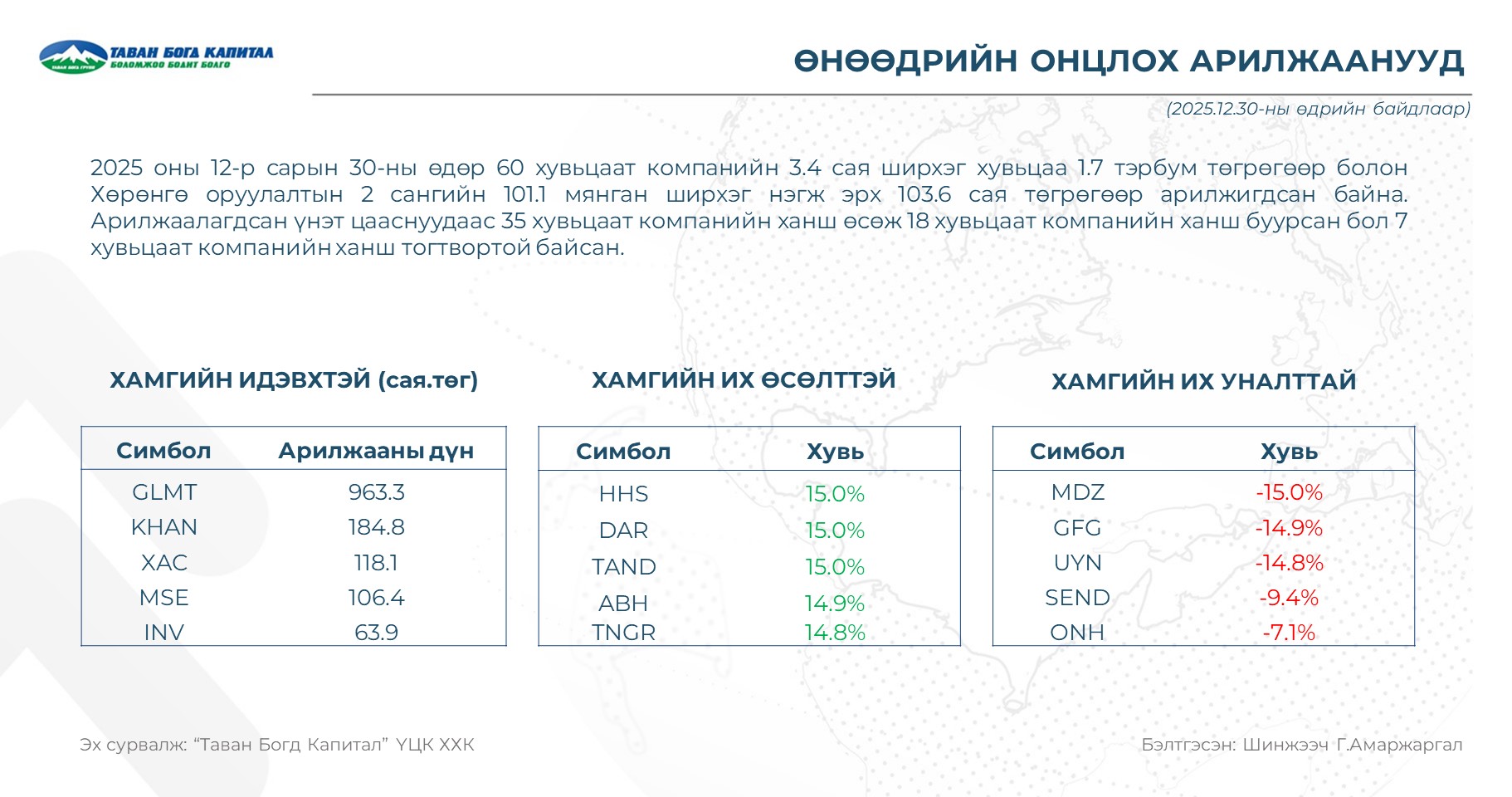 - Өнөөдөр GLMT хувьцаа арилжааны идэвхээр тэргүүлж 963.3 сая төгрөгийн арилжаа хийгдлээ.