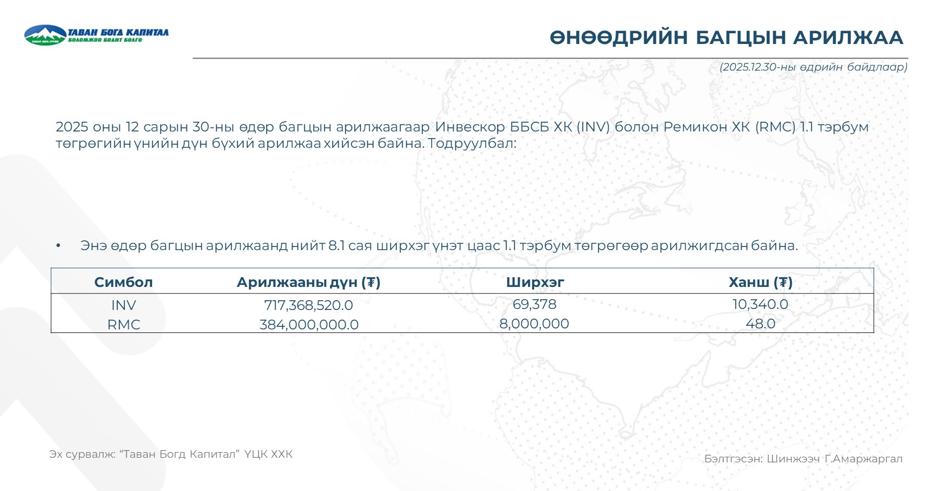 - Энэ өдөр багцын арилжаанд INV, RMC хувьцаанууд 1.1 тэрбум төгрөгөөр арилжигдсан байна.