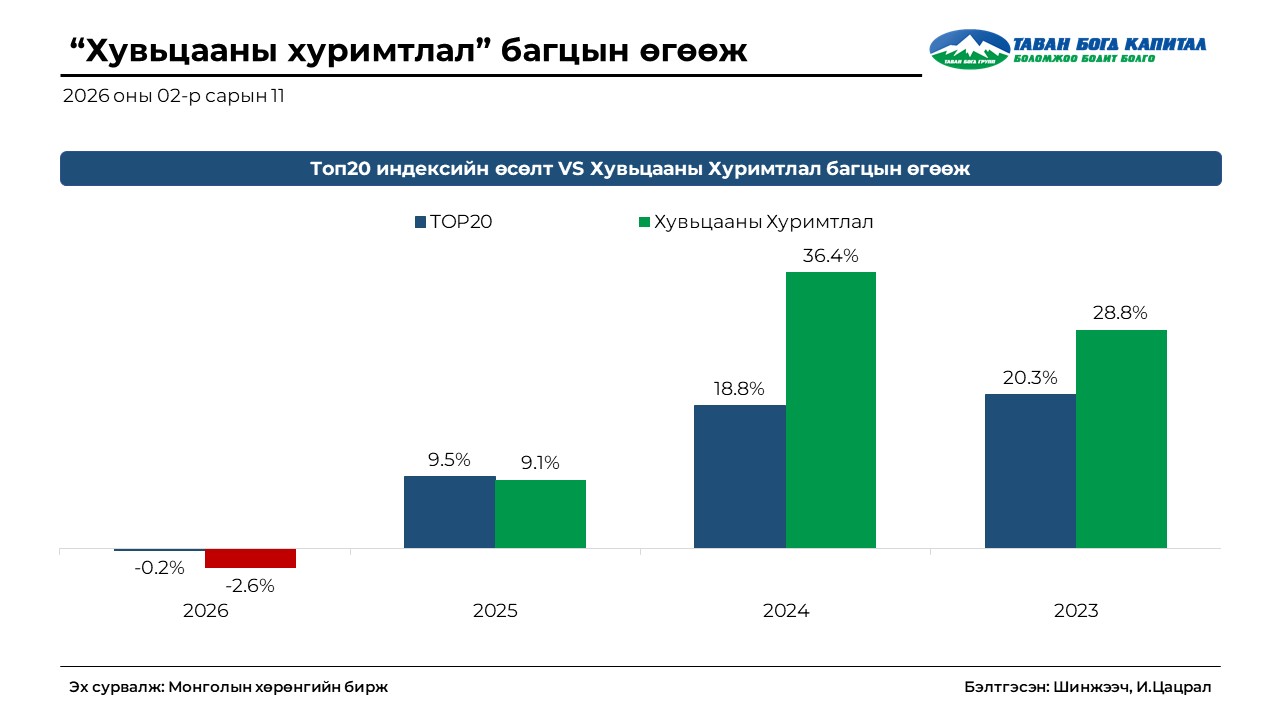 - TOП20 индекс 2026 оны эхнээс 0.2%-аар буурч 54,637.3 нэгж боллоо.