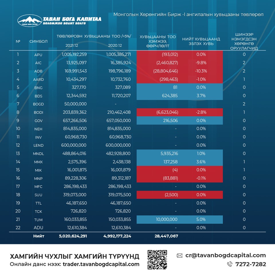 - Хувьцаагаа цуглуулсан компаниуд болох Түмэн шувуут, Мандал даатгал, БиДиСек, МахИмпекс, Баянгол ЗБ, Говь ХК-ийн хувьд тухайн компанийнхаа 0.02%-аас 5% хүртэл хувьцааг олон нийтээс авсан үзүүлэлттэй байна. Мөн эдгээр компаниудын хувьцааны ханш 2021 онд бүгд өссөн байгаа нь сонирхол татаж байна.