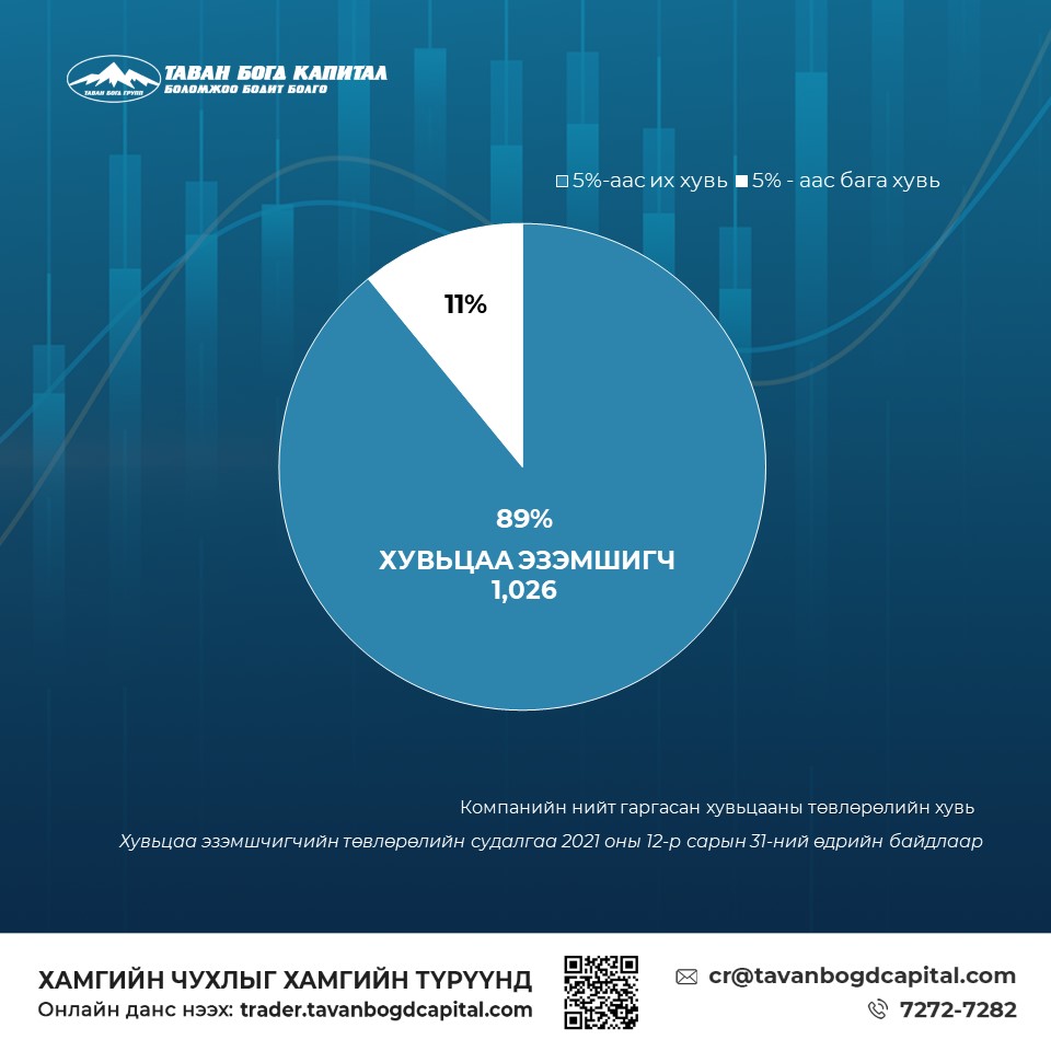 - Хувьцааны төвлөрөл нь компанийн нийт гаргасан хувьцааны 5%-аас их хувийг эзэмшдэг том хувьцаа эзэмшигчдийн хувьцаагаар хэмжигддэг. Ийнхүү ҮЦТХТ-н 2021 оны 12 дугаар сарын 31-ний төвлөрлийн мэдээлэлд үндэслэн тооцвол, бүртгэлтэй 320 компанийн нийт гаргасан хувьцааны 89.1% нь 1,026-хан хувьцаа эзэмшигчид төвлөрсөн байна.