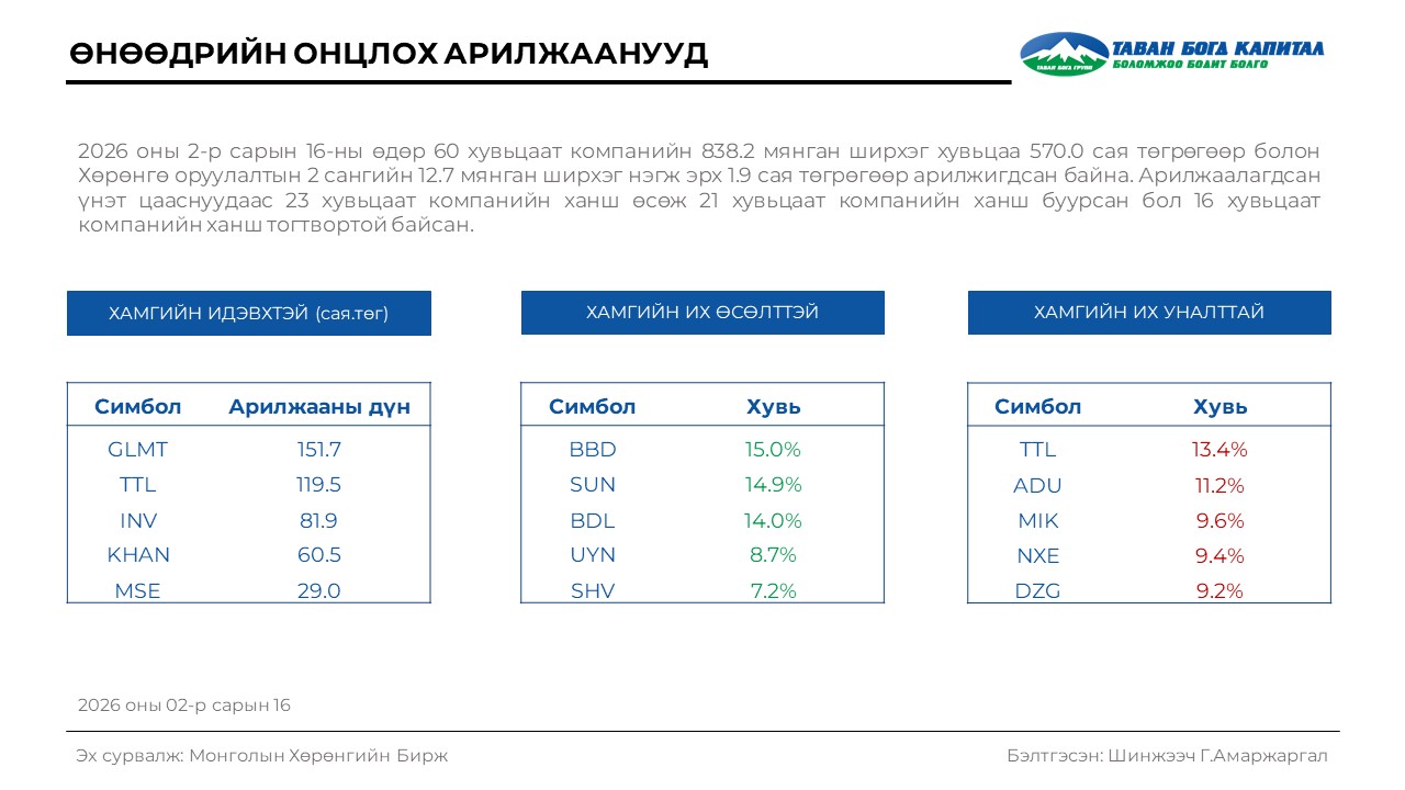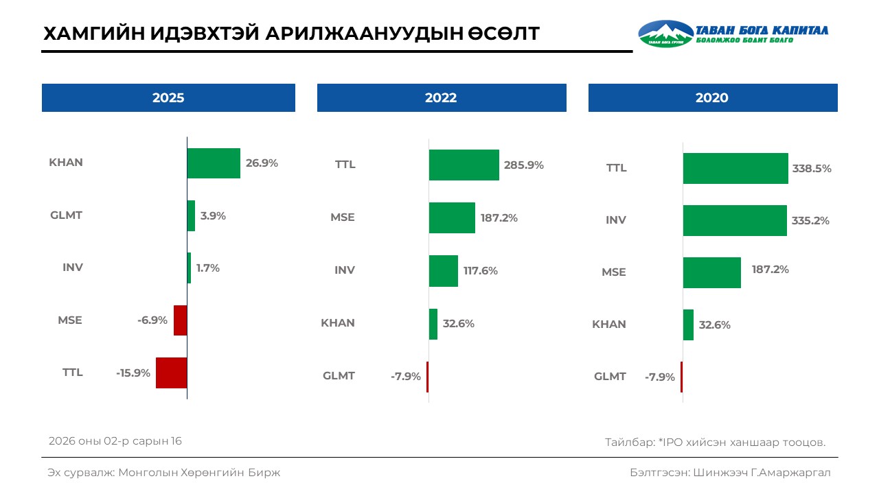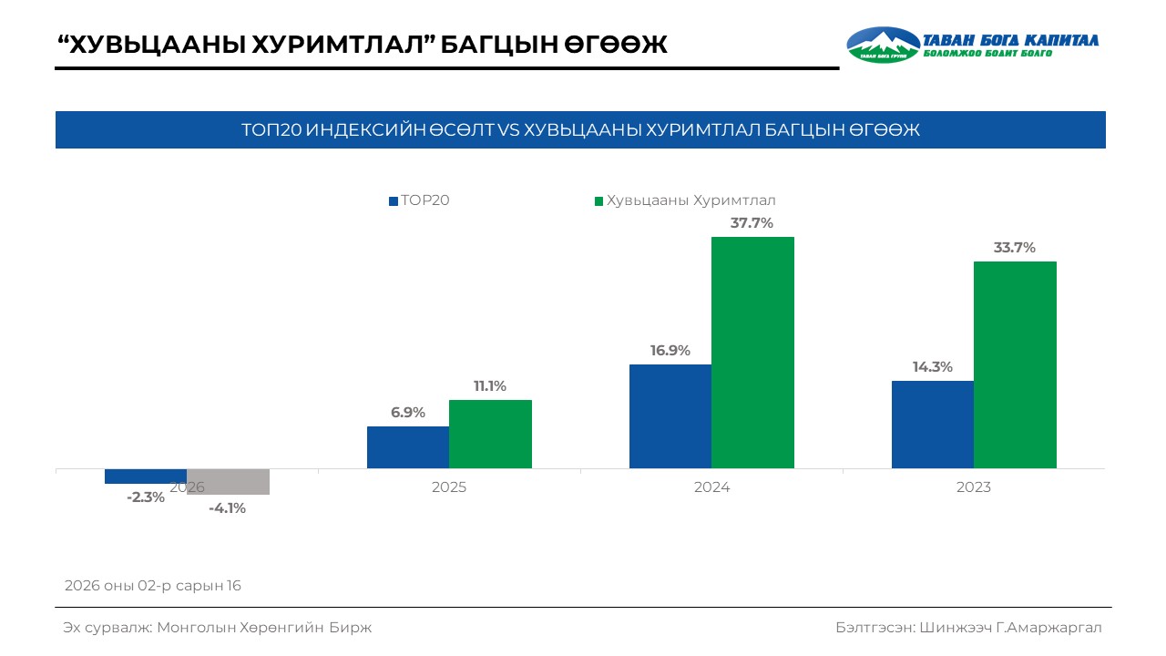 TOП20 индекс 53,619.5 нэгж болсон нь өмнөх өдрийн хаалтын ханштай харьцуулахад 2.1%-аар буурсан үзүүлэлт байлаа. Хэрэв 2026 оны эхэнд ₮1,000,000 -р хөрөнгө оруулалт хийсэн бол ₮979,000 болох байжээ.