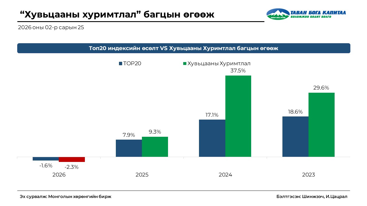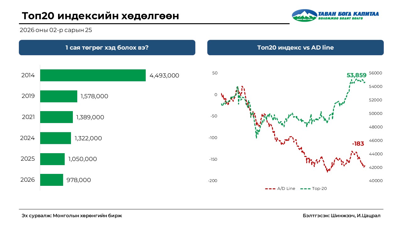 - TOП20 индекс 2026 оны эхнээс ямар ч өөрчлөлтгүйгээр 53,858.7 нэгж боллоо.