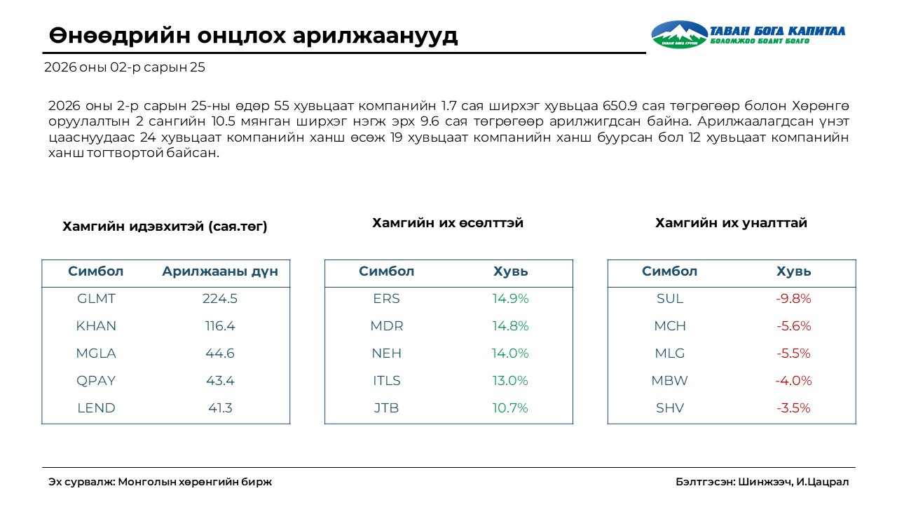 - Өнөөдөр GLMT хувьцаа арилжааны идэвхээр тэргүүлж 224.5 сая төгрөгийн арилжаа хийгдлээ.