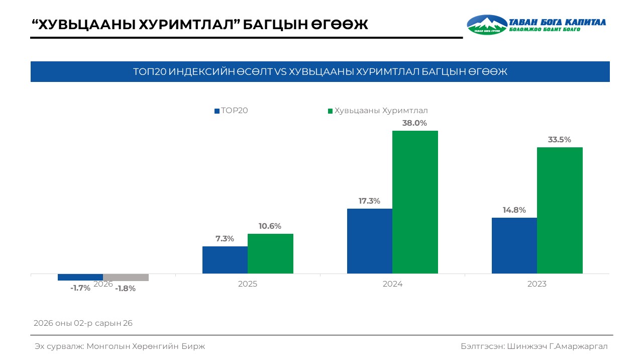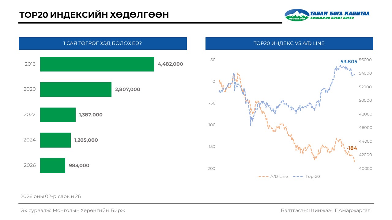 TOП20 индекс 53,805.4 нэгж болсон нь өмнөх өдрийн хаалтын ханштай харьцуулахад 0.1%-аар буурсан үзүүлэлт байлаа. Хэрэв 2026 оны эхэнд ₮1,000,000 -р хөрөнгө оруулалт хийсэн бол ₮983,000 болох байжээ.