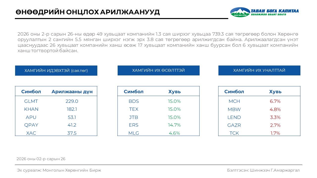 - Өнөөдөр GLMT хувьцаа арилжааны идэвхээр тэргүүлж 229.0 сая төгрөгийн арилжаа хийгдлээ.