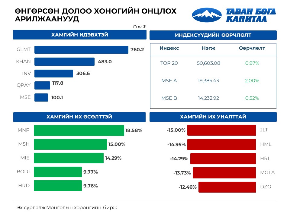 Монголын хөрөнгийн бирж дээр өнгөрсөн долоо хоногт арилжааны идэвх нийт ₮7.07 тэрбумийн үнийн дүнтэй 5.08 сая ширхэг үнэт цаас арилжаалагдсан байна. Арилжааны үнийн дүнгээр Голомт Банк ХК, Хаан банк ХК, Инвескор ББСБ ХК, Инновэйшн инвестмент ХК болон Монголын хөрөнгийн бирж ХК зэрэг компаниуд зах зээлийг тэргүүлжээ.