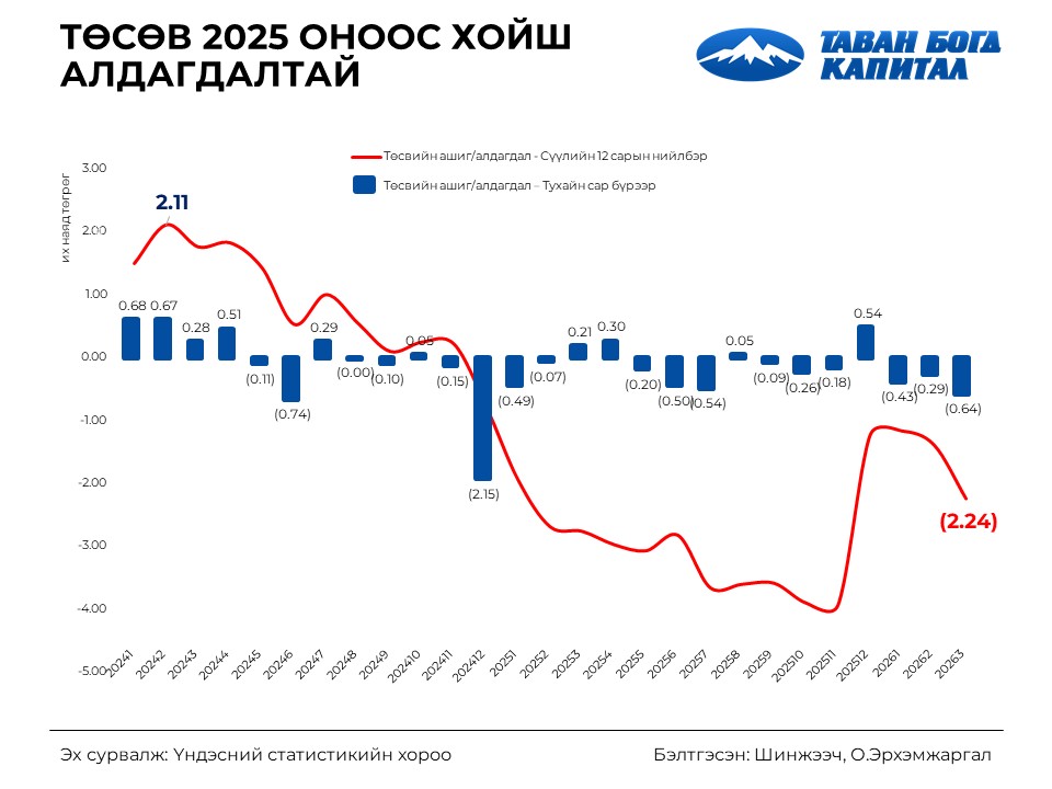 Энд л гол зураг харагдаж байна. 2025 оноос хойш ашигтай гарсан сар ердөө 4, үлдсэн бүх саруудад төсөв алдагдалтай байсан байна. Сүүлийн 12 сарын ашиг/алдагдалын нийлбэр -₮2.24 их наяд-д хүрсэн нь орлогын өсөлт зардлын хурдыг гүйцэхгүй байгааг тодорхой харуулж байна.
