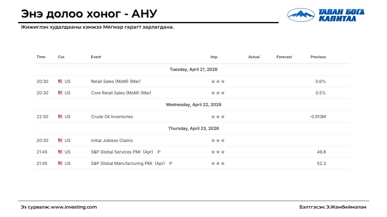 Онцлох мэдэгдэл: Өнгөрсөн Лхагва гарагт Donald Trump-с “Бид Ираны цэргийн хүчинг бүрэн устгасан. Энэ дайн дуусахад тун ойрхон байна. Иранд хэлэлцээр хийх хүсэлт маш их байгаа” гэх мэтчилэн эерэг мэдээлэл өгчээ. Дипломат хэлэлцээр үргэлжлэх эерэг хүлээлт зах зээлд үүсэж S&P500 индекс ханш түүхэн дээд амжилтаа шинэчлэн тогтоолоо. Басхүү өнгөрсөн Мягмар гарагт Trump-с ойрын хугацаанд Пакистаны нийслэл Исламабад хотод дахин уулзаж хэлэлцээр хийх магадлалтай хэмээн New York Post-д хэлжээ...Дэлгэрэнгүйг эндээс уншина уу