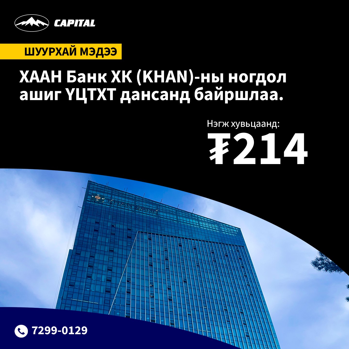 ХААН банк ХК-аас 2025 оны цэвэр ашгаас нэгж хувьцаанд ₮214 ногдол ашиг олгохоор шийдвэрлэсэн бөгөөд уг мөнгөн дүн хувьцаа эзэмшигчдийн ҮЦТХТ дахь дансанд шилжиж эхлээд байна.